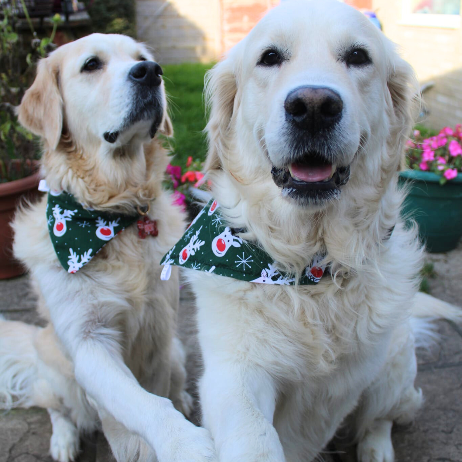 The cheerful pattern features adorable Rudolph faces with bright red noses, playful snowflakes, and a vibrant green background, making it an eye-catching addition to your dog's Christmas look. Ideal for holiday photos, walks, and family gatherings, this bandana adds a touch of festive cheer to any occasion.